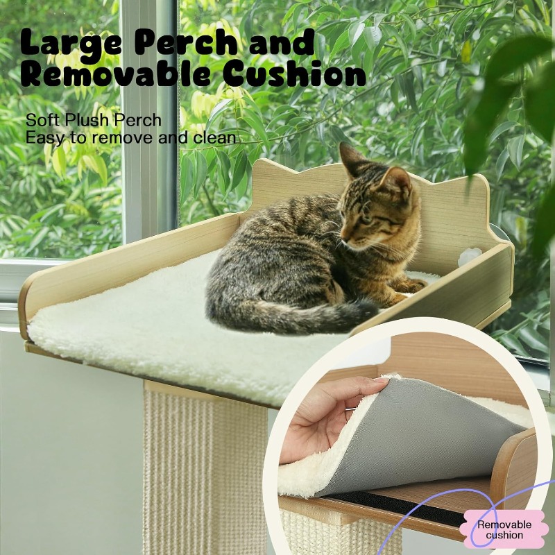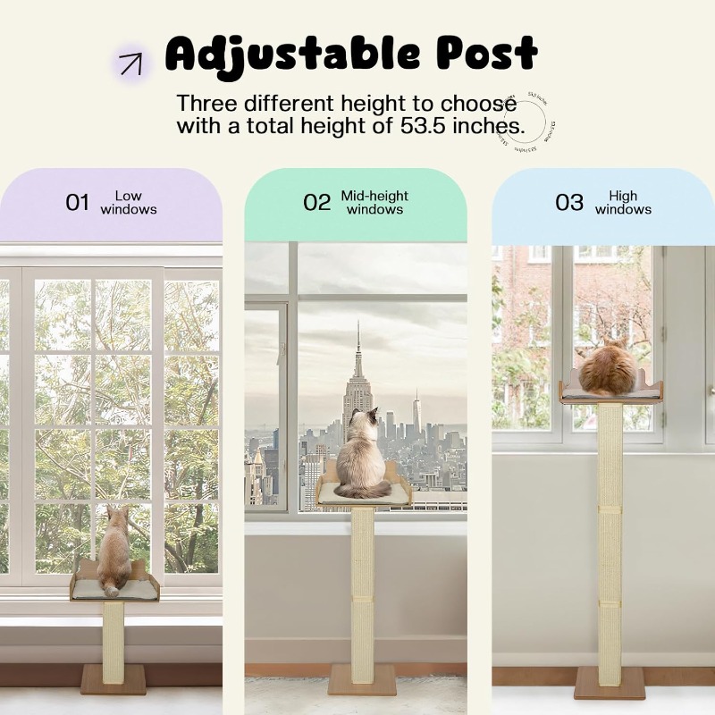 Cat Window Perch with Thick Sisal Scratching Post | Adjustable Tall Cats Scratching Post with 2 Upgrade Suction Cups, Fluffy Cushion Sisal